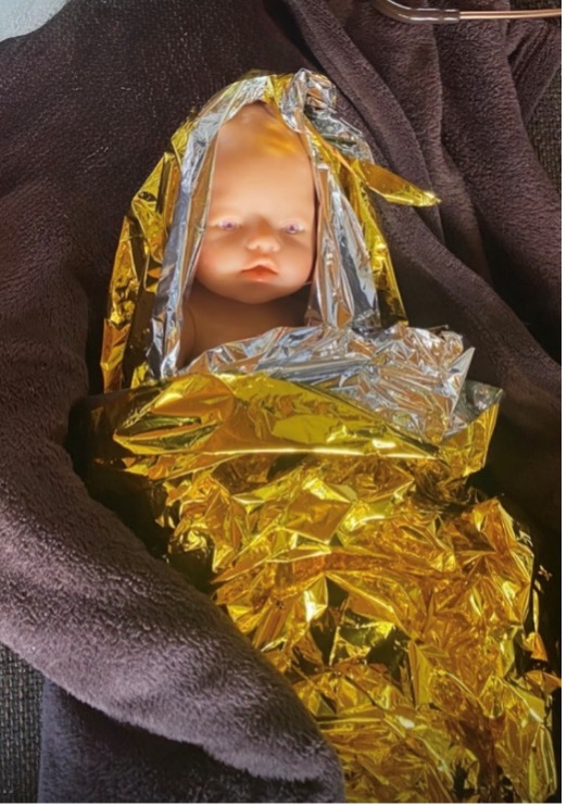 Ein kleiner Tipp: Falls keine Silberwindel zur Hand ist, funktioniert auch eine normale Rettungsdecke (siehe Bild). Hier einfach in eine der vier Ecken einen Knoten machen und diese Ecke wie eine Mütze an den Kopf des Kindes an formen. Neugeborene und Säuglinge verlieren fast 50% der Wärme über ihren Kopf. Die Temperatur des Neugeborenen soll zwischen 36,5°C und 37,5°C gehalten werden.